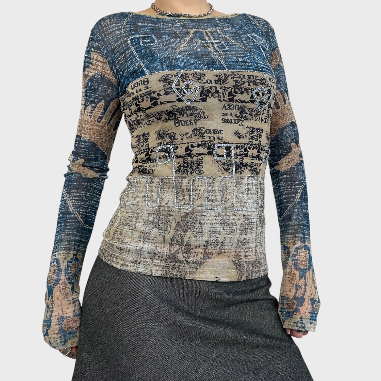 Save the Queen Blue Graphic Long Sleeve Mesh Top - S/M