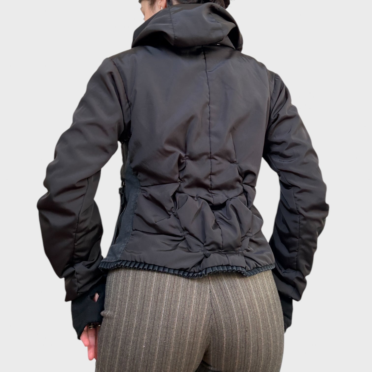 Features a frilly hem and ruched details. Has a hood with a drawstring & thumb holes. Made from 100% polyester.