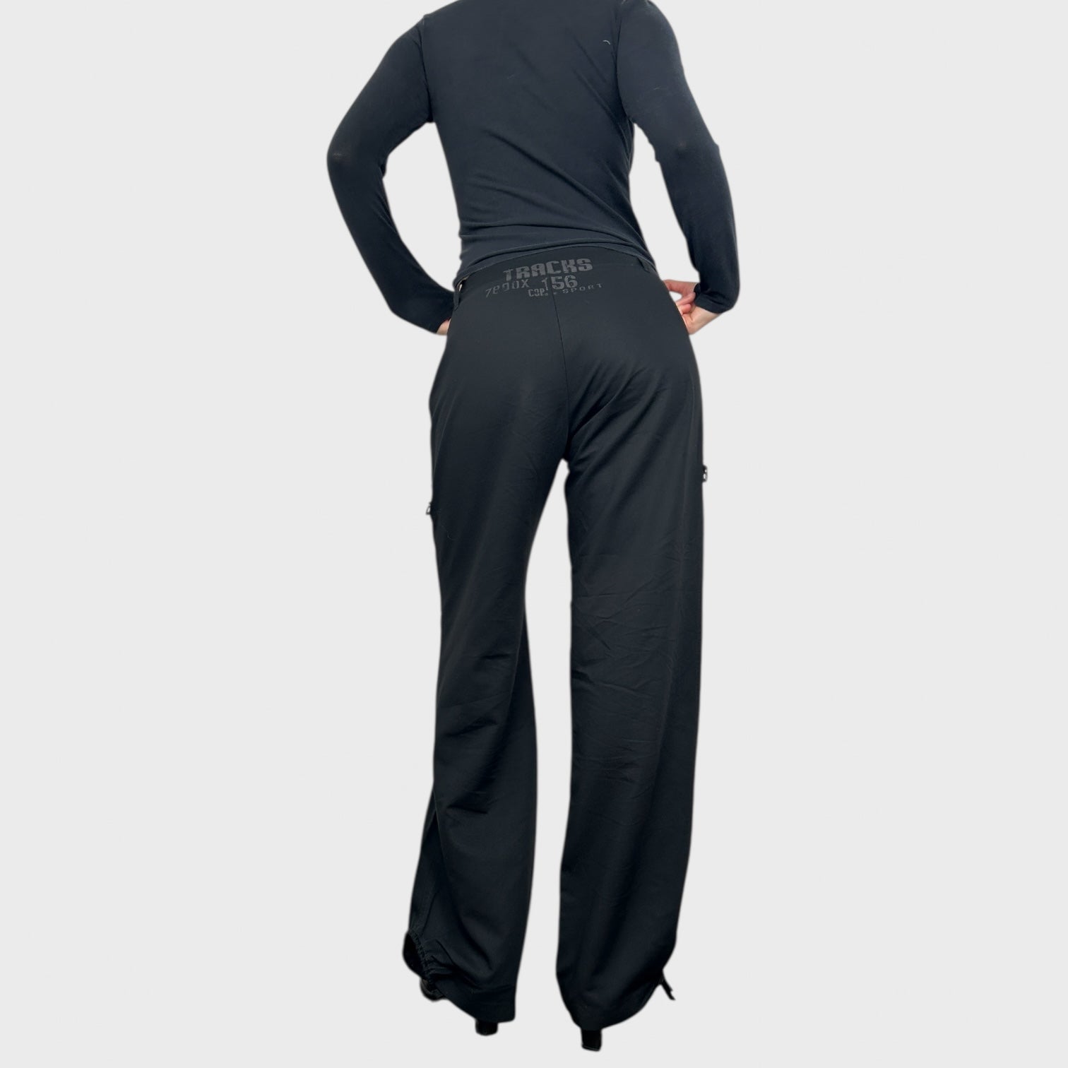Black trousers with graphic print at the back and circle tie-side details on each leg.