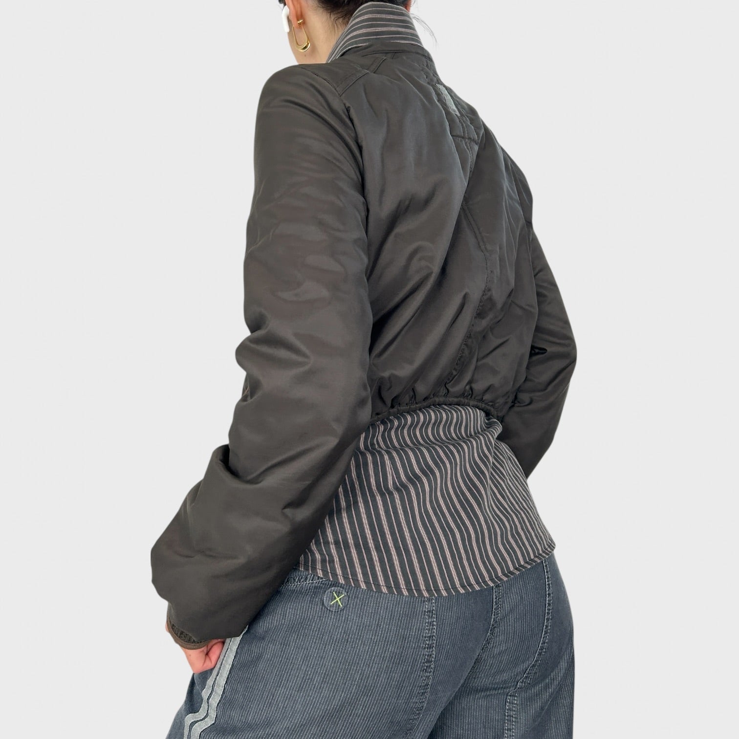 Lightweight puffer-style material with drawstrings at the front to cinch the waist.