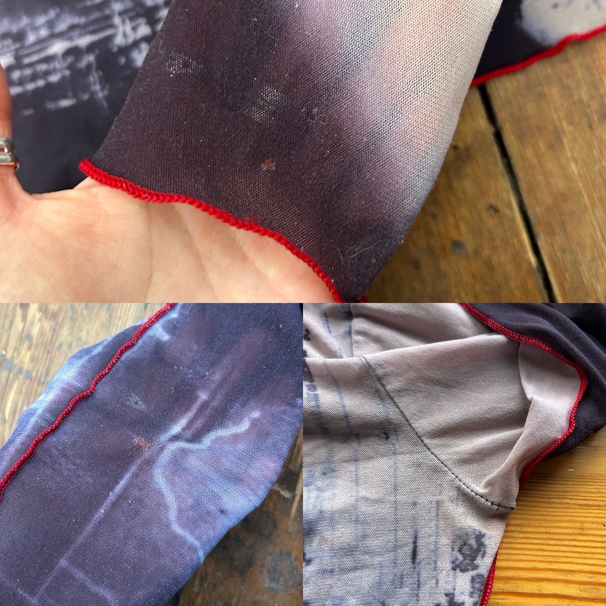 Condition: Overall, the condition is great considering its from the 90s. There are a few very tiny holes on the arms (likely from being washed aggressively). Hard to notice unless you look super close!