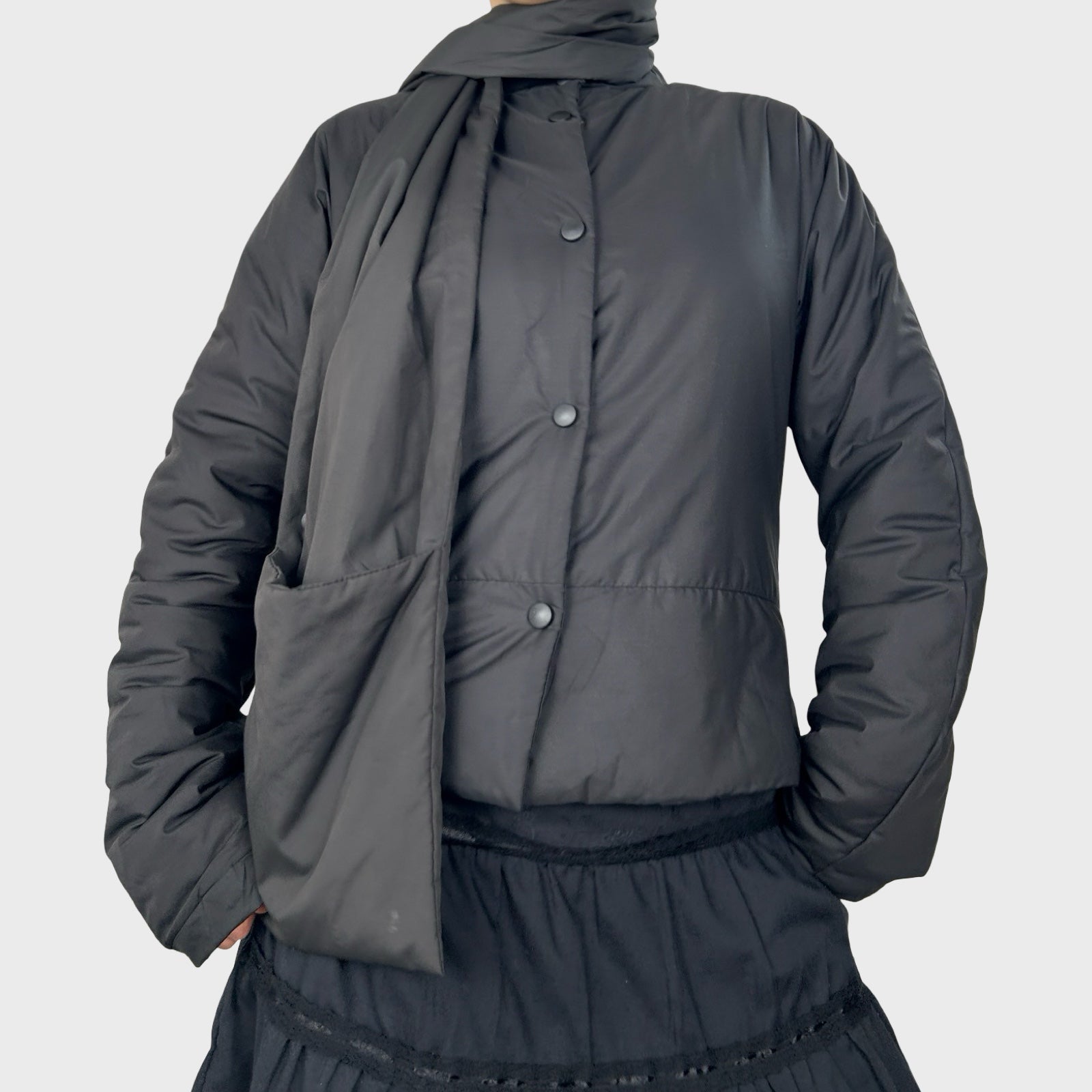 Super unique Cop Copine puffer jacket featuring a detachable bag/scarf attachment. Lightweight but warm