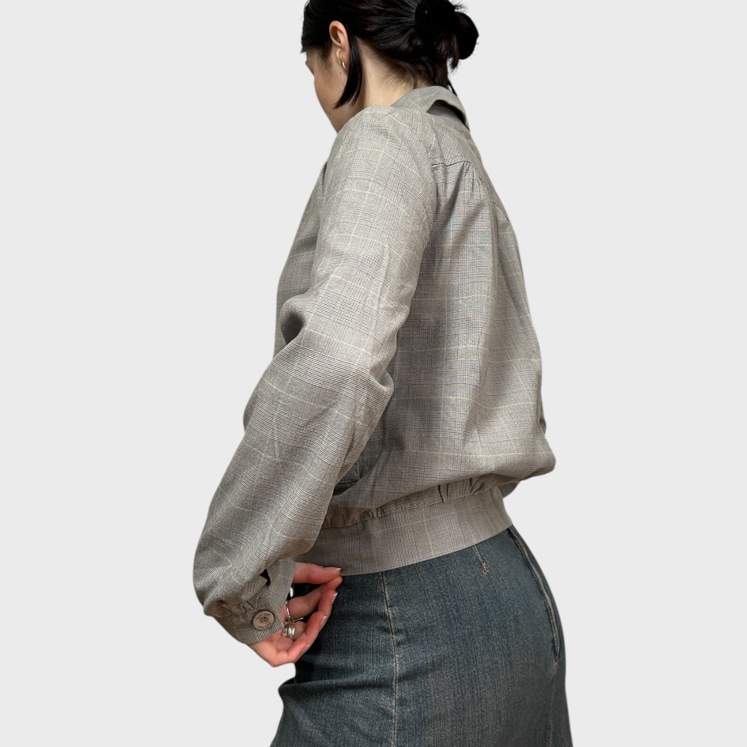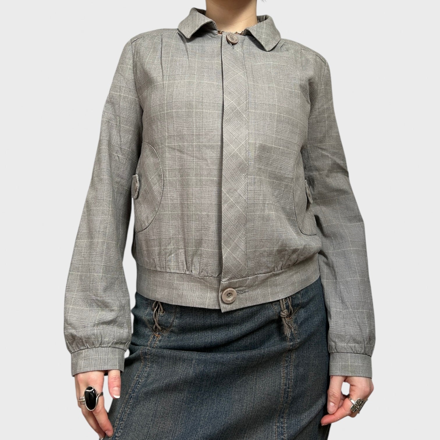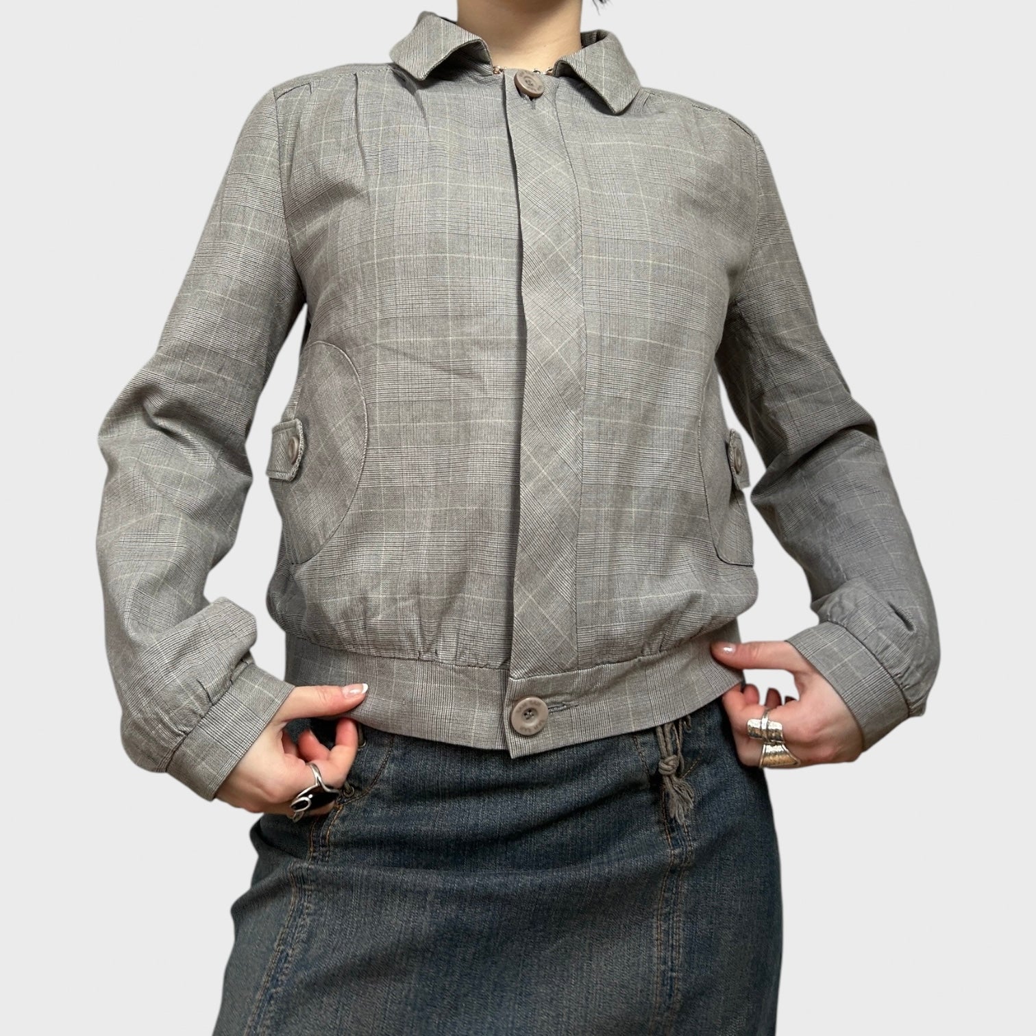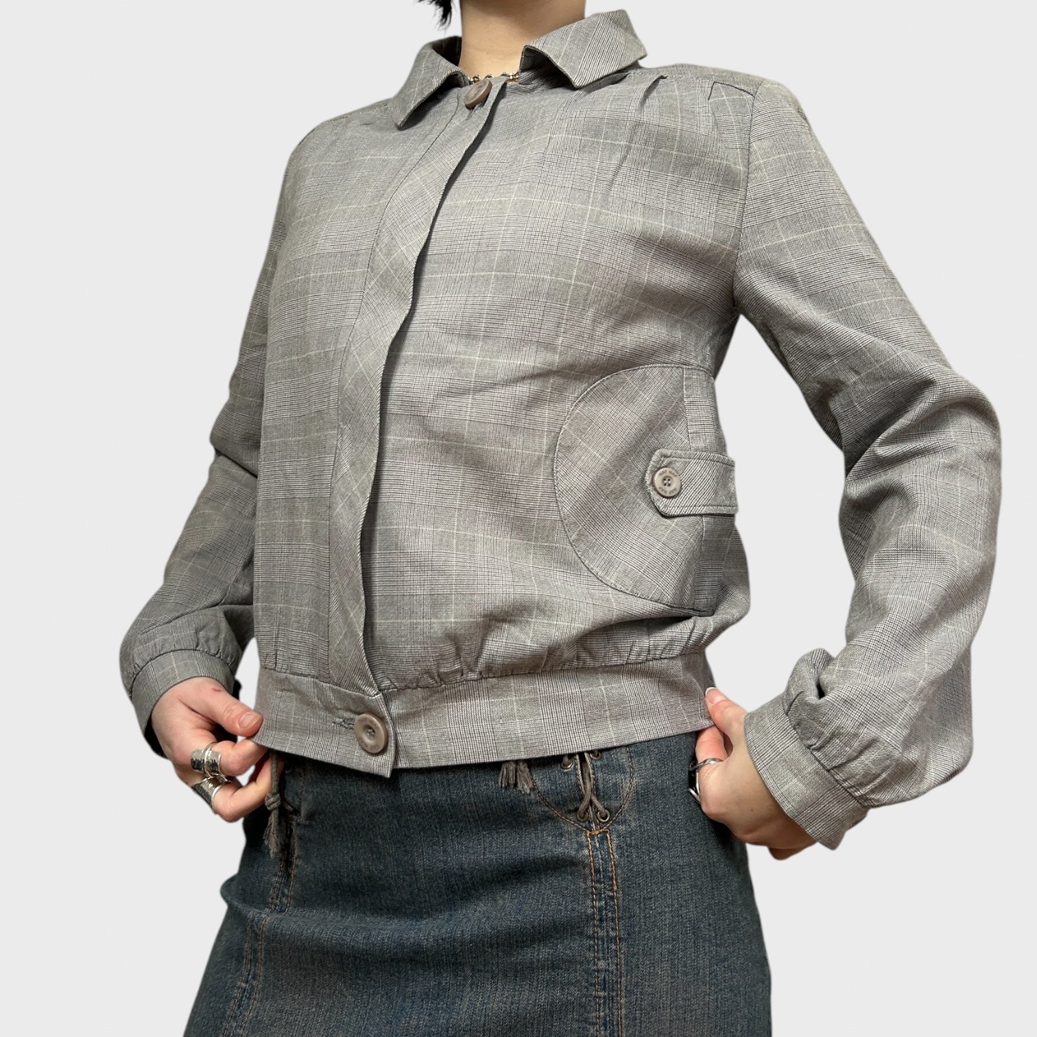 Grey Checkered Zip-Up Collared Bomber Jacket