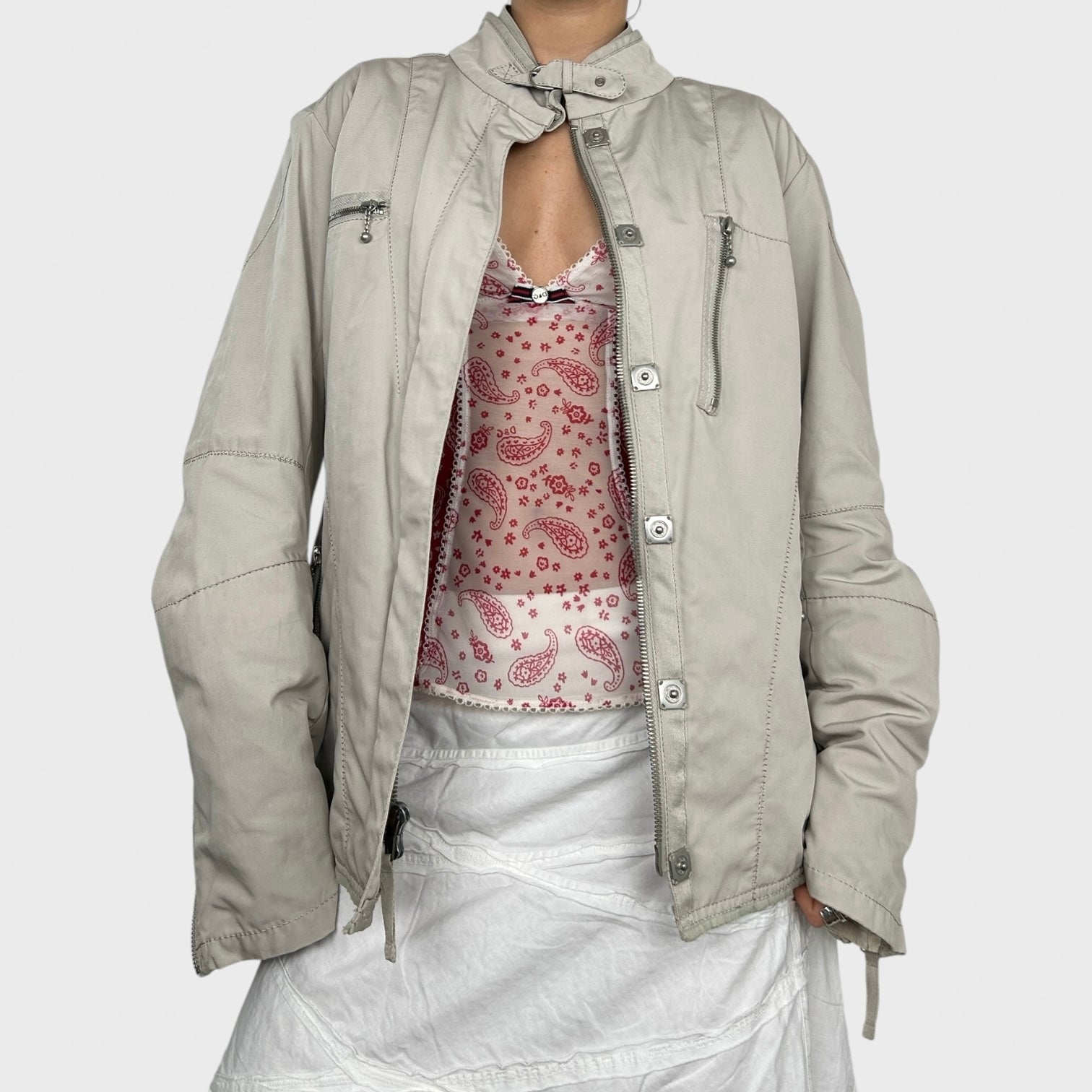 Features chunky silver hardware, utility-style details, and a buckle fastening at the neck.
