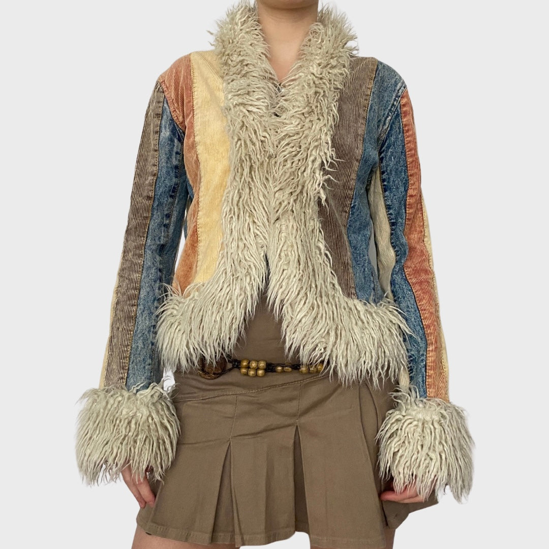 Iconic y2k 90s Miss Posh corduroy multi-coloured afghan jacket. Featuring denim, cream and orange corduroy stripes with a cream faux fur trim on the cuffs and neckline. Perfect for the festival season!