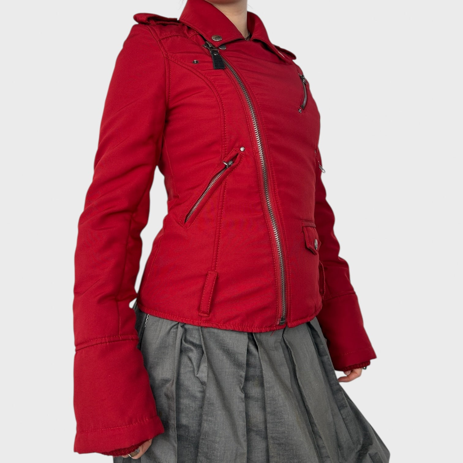 Red asymmetric zip coat with chunky silver detail throughout.