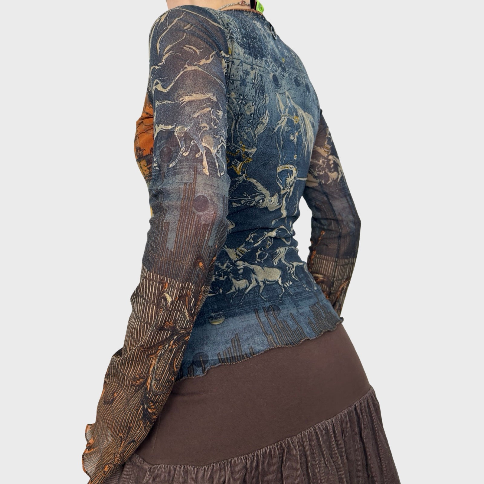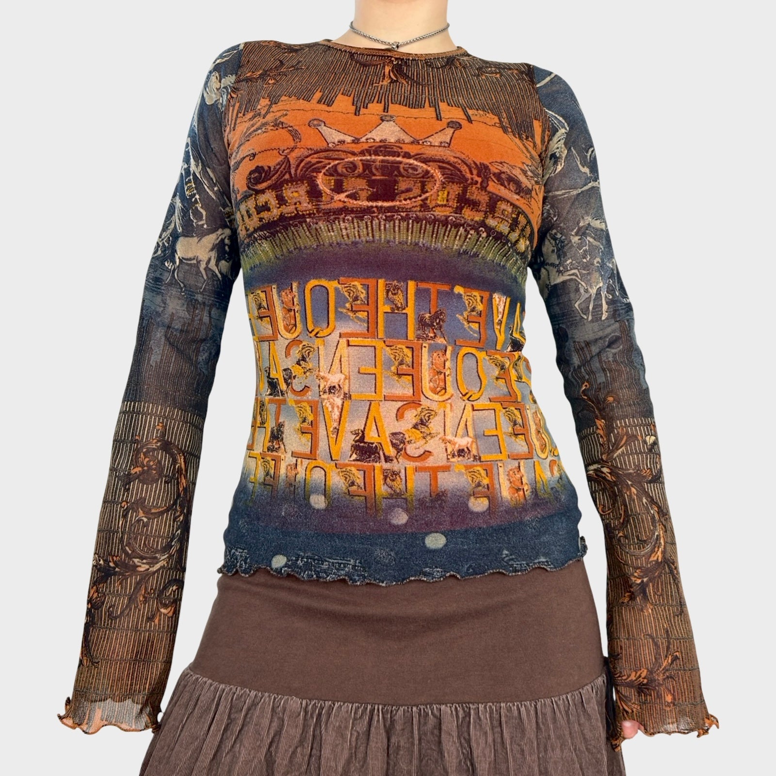 Save The Queen Graphic Mesh Long Sleeve Top - S/M