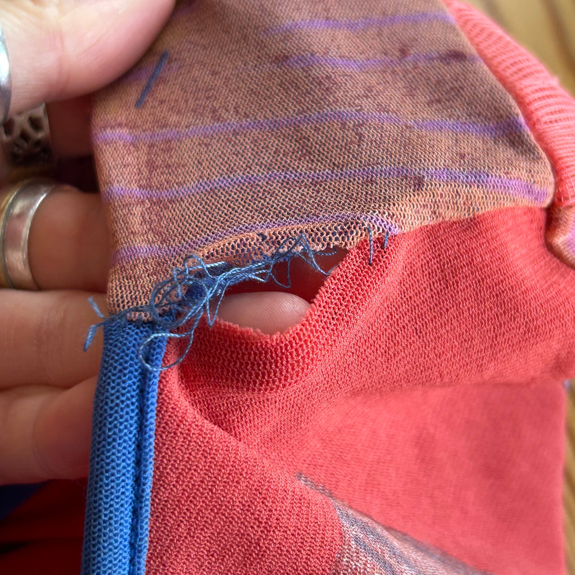 Condition: Overall ok condition. One shoulder seam has come loose creating a hole. Could be stitched and repaired. Reflected in the price.