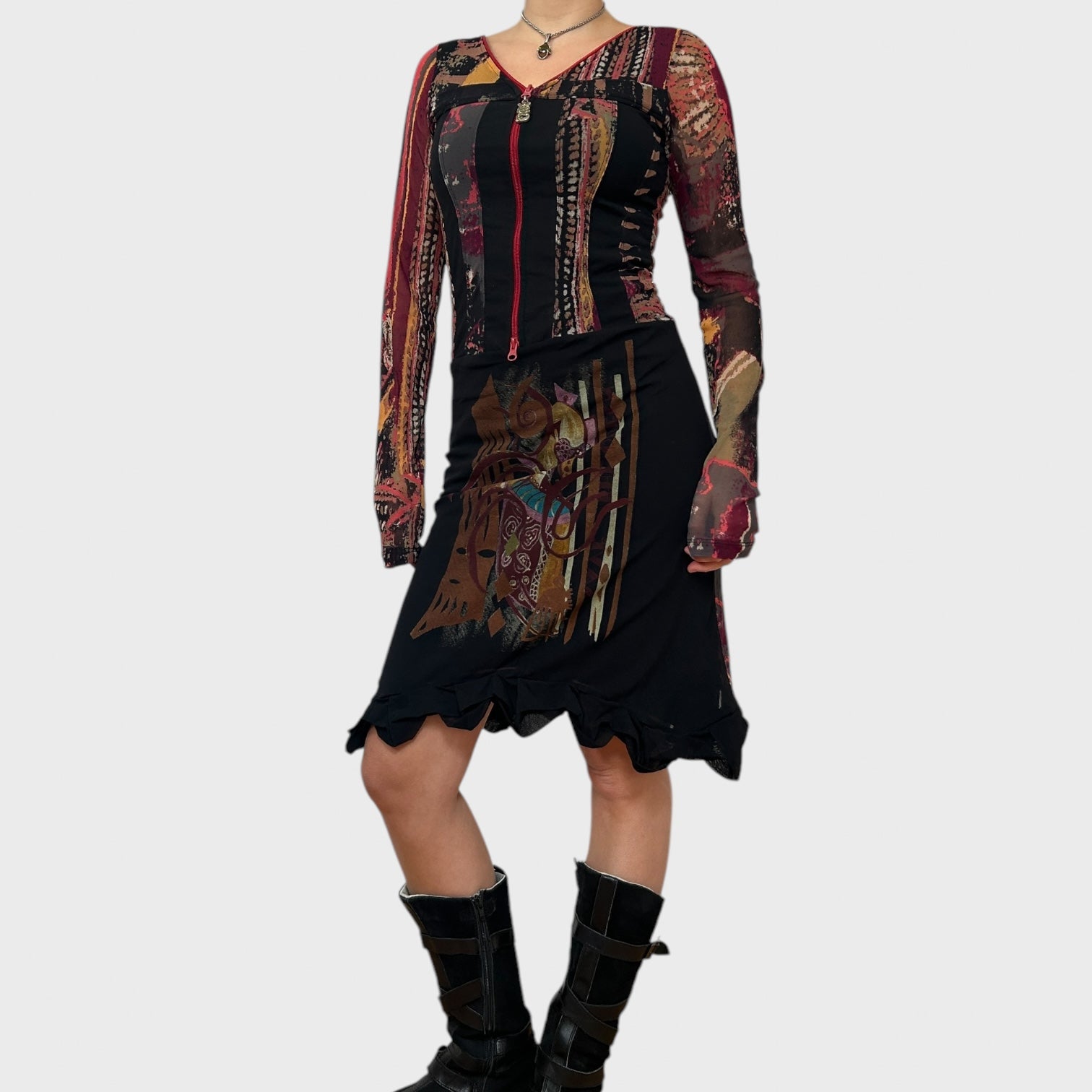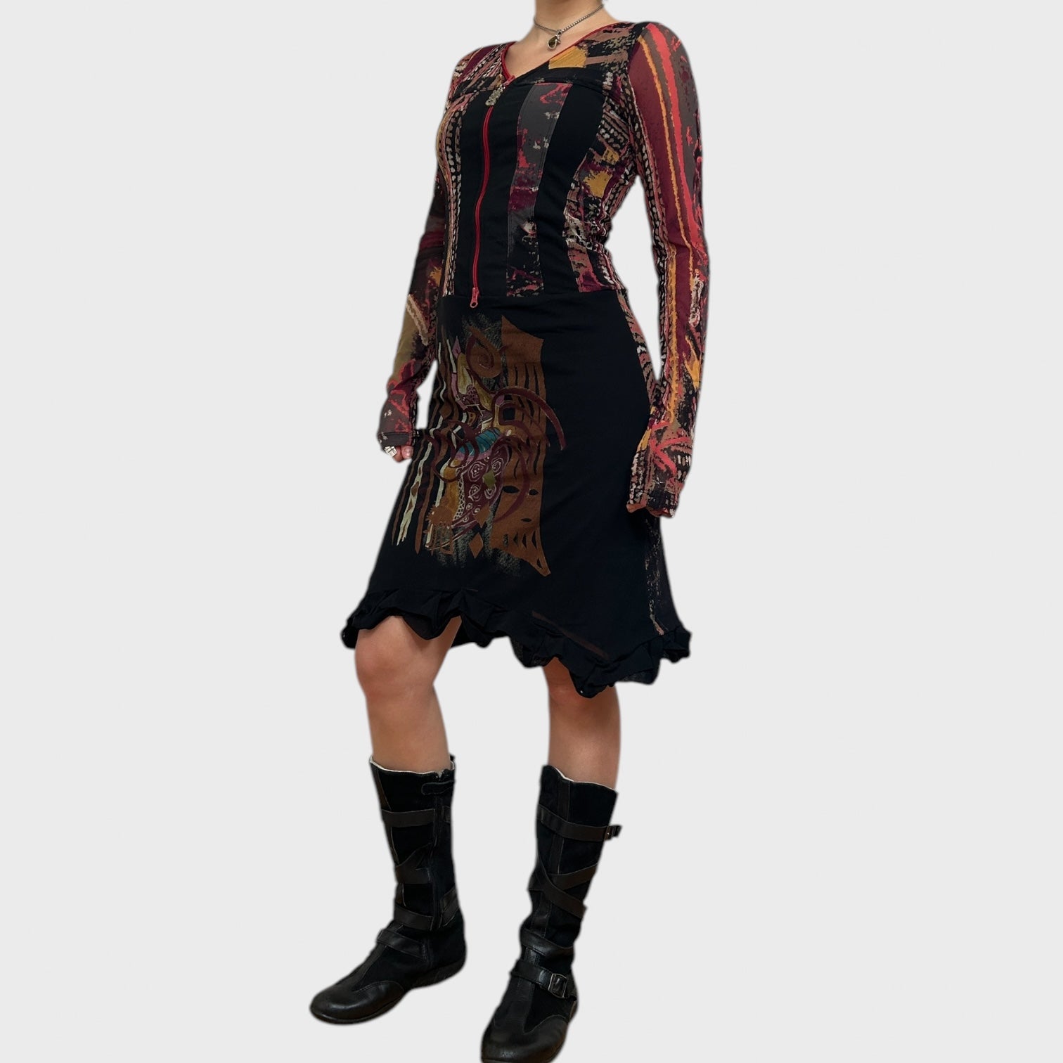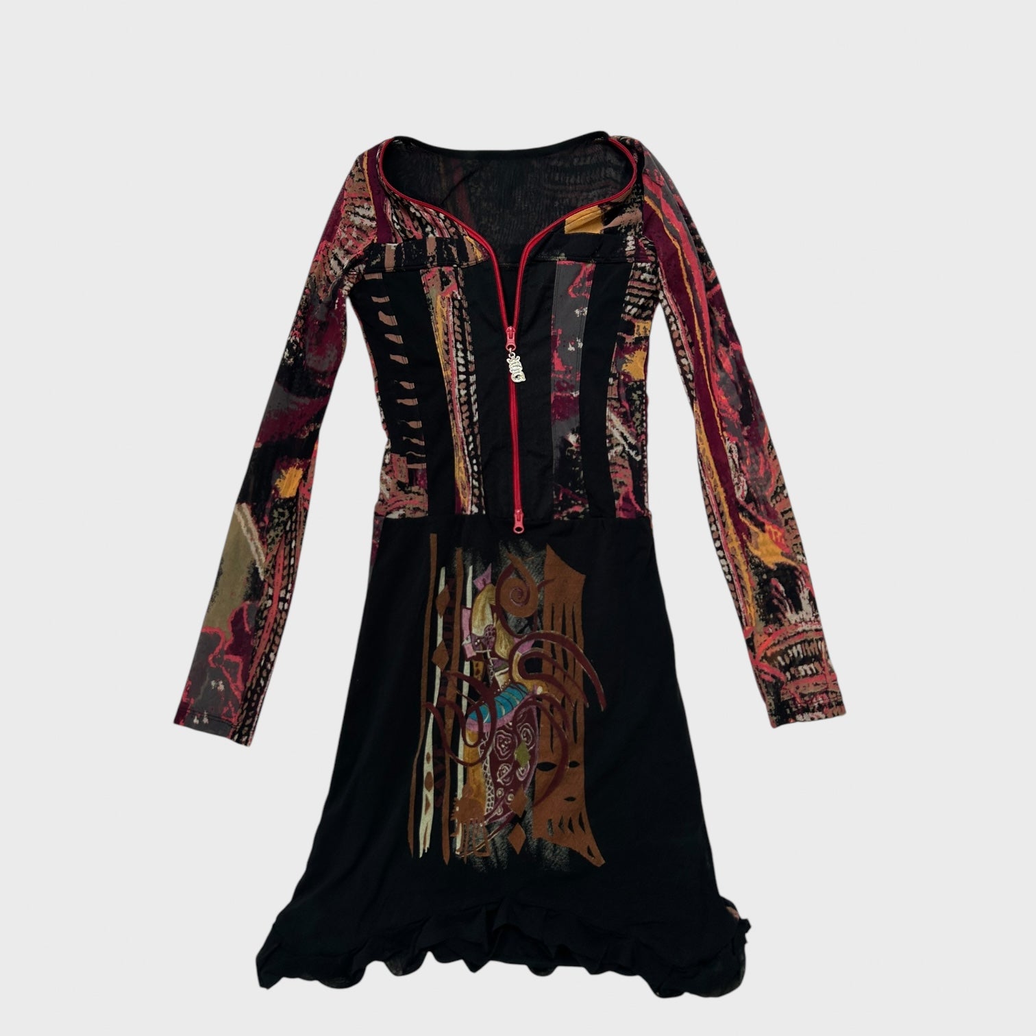 As seen on Bella Hadid. Vintage, graphic, mesh, zip-up, stretchy, midi dress.