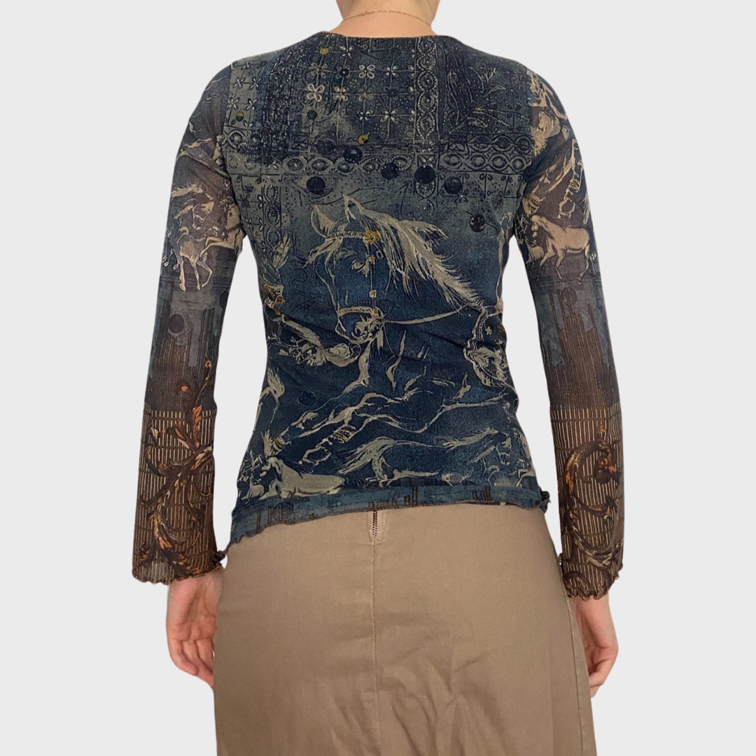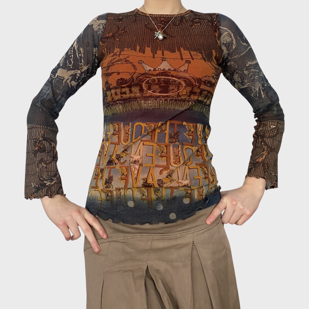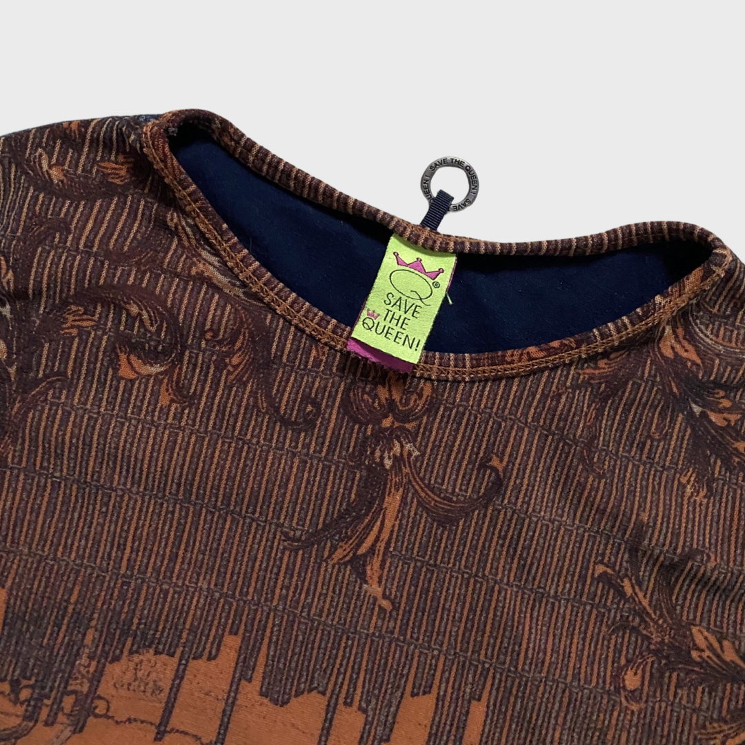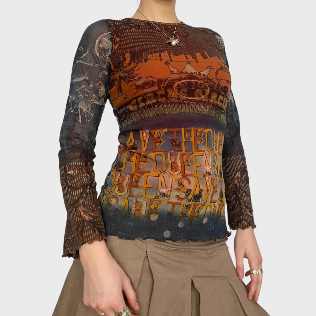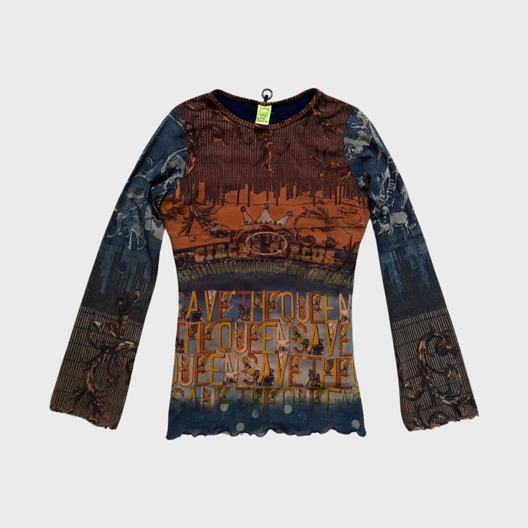Vintage Save the Queen long-sleeve mesh top. Featuring a graphic pattern and STQ logo on the front. Double lined for comfort! An iconic STQ piece you need in your wardrobe.